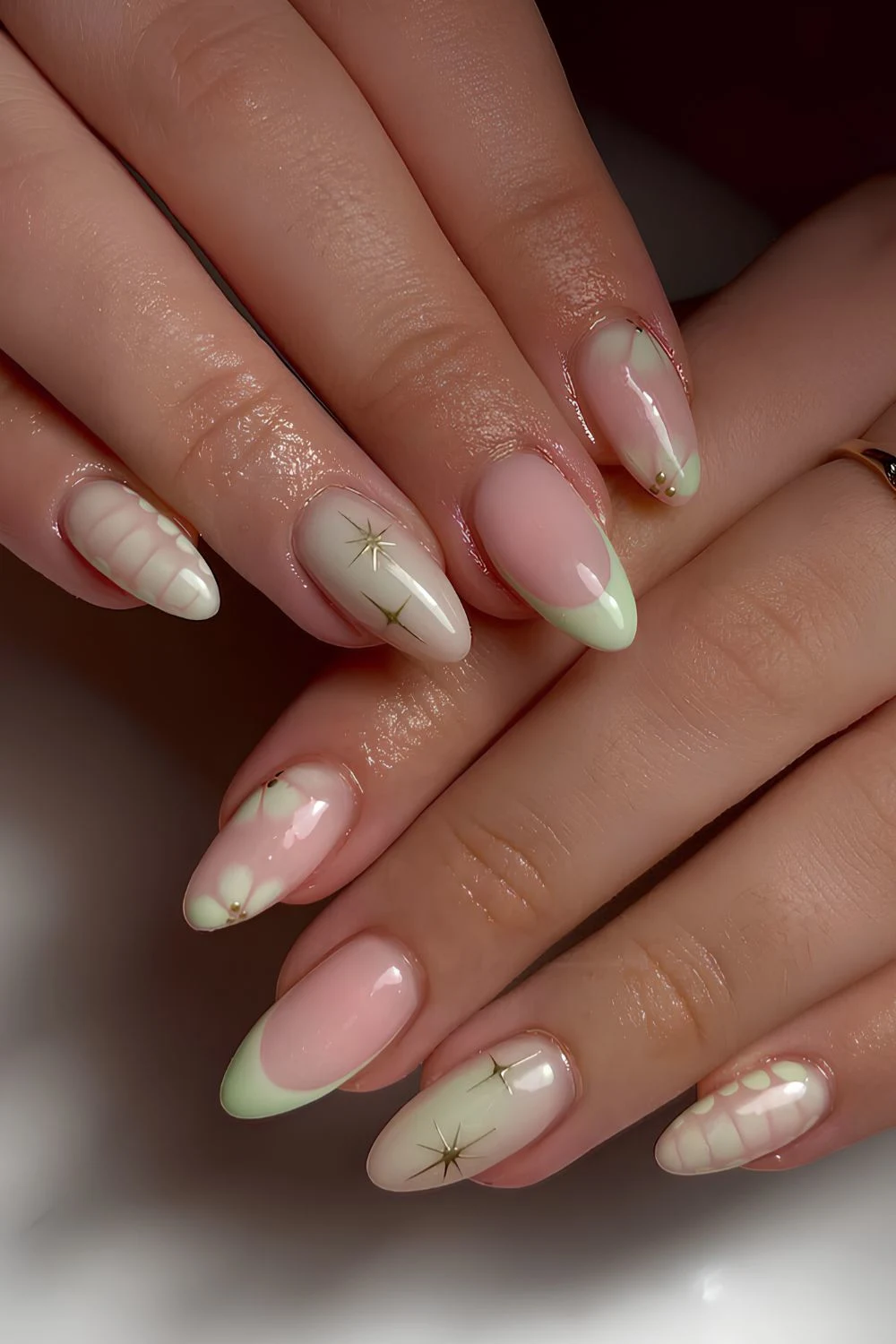 Florals, ombré, swirlies, gold details, French tips with cutouts—every nail needs to look like it has its own drama going on. If you’re here for the full green-nail aesthetic dump, THIS is the move.