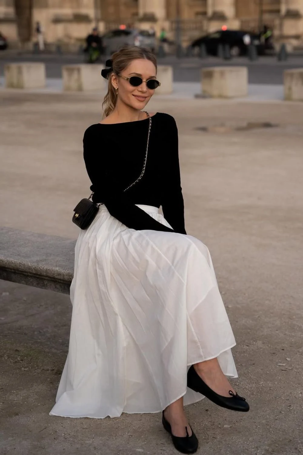 Old money trick #1: black and white, but make it dramatic. Do a black top with a flowy white maxi or midi—it’s the spring power move. Add ballet flats and tiny accessories.